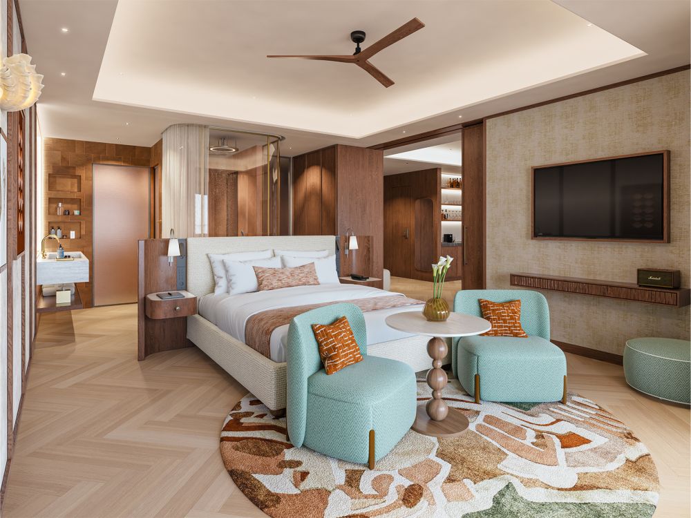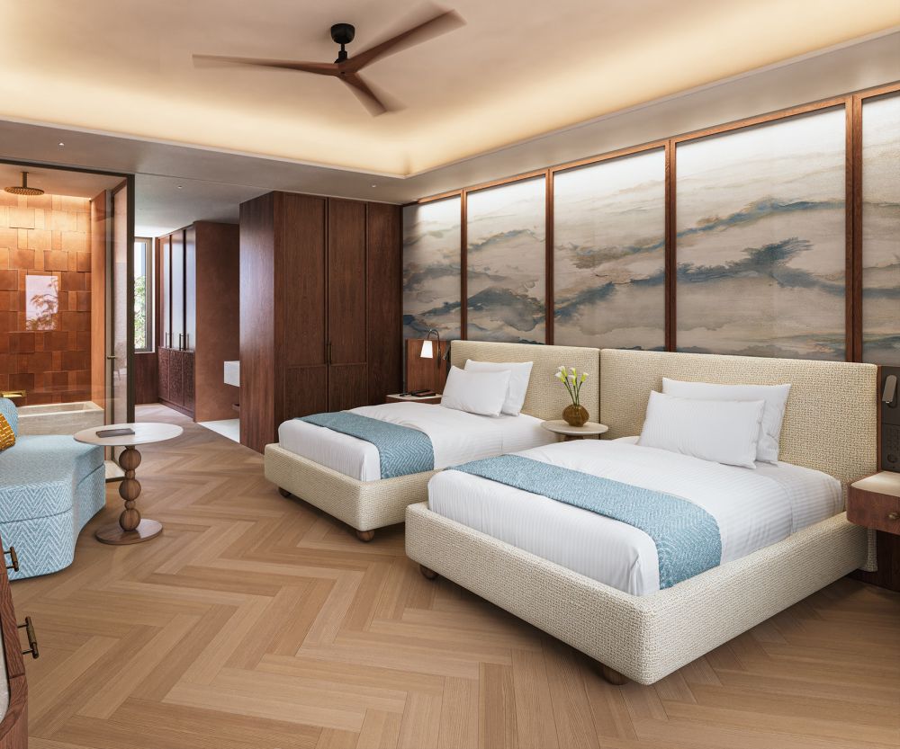 Familiekamer met lateraal zeezicht (2-5 pers.), 2 badkamers (bad, regendouche), sauna, koffiezet en privézwembad: 2 slaapkamers (type 26)